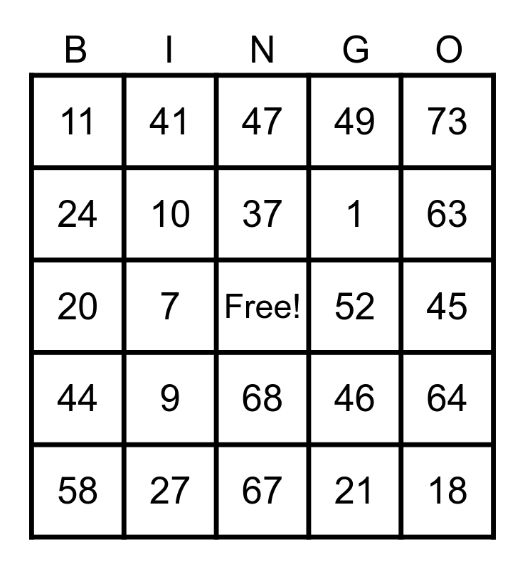 This bingo card has a free space and 24 words: 9, 27, 37, 58, 73, 11, 24, 41, 52, 68, 1, 20, 46, 64, 10, 21, 45, 47, 63, 7, 18, 44, 49 and 67.