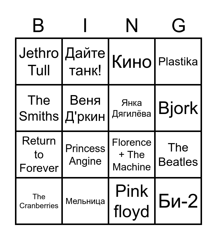 This bingo card has 16 words: Мельница, The Beatles, Кино, Jethro Tull, Return to Forever, Дайте танк!, Florence + The Machine, Pink floyd, The Smiths, Веня Д'ркин, The Cranberries, Plastika, Princess Angine, Bjork, Янка Дягилёва and Би-2.