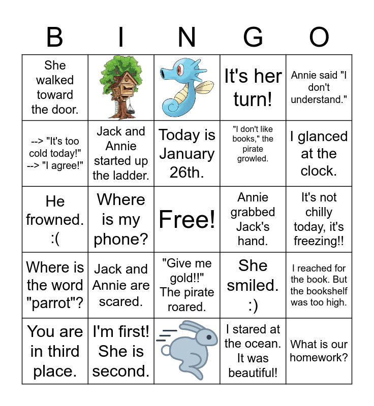 This bingo card has 3 images, a free space and 21 words: Jack and Annie are scared., I'm first! She is second., Today is January 26th., You are in third place., Annie said "I don't understand.", She walked toward the door., --> "It's too cold today!" --> "I agree!", Annie grabbed Jack's hand., "Give me gold!!" The pirate roared., "I don't like books," the pirate growled., He frowned. :(, She smiled. :), I reached for the book. But the bookshelf was too high., Jack and Annie started up the ladder., I stared at the ocean. It was beautiful!, It's not chilly today, it's freezing!!, I glanced at the clock., Where is my phone?, What is our homework?, Where is the word "parrot"? and It's her turn!.