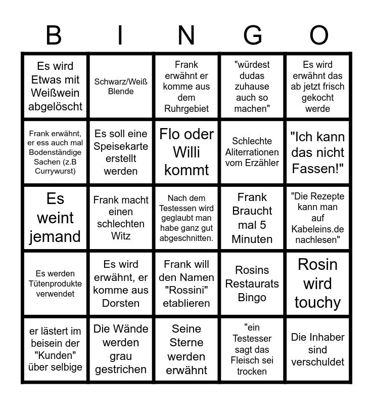 This bingo card has 25 words: Es wird erwähnt, er komme aus Dorsten, Seine Sterne werden erwähnt, Flo oder Willi kommt, er lästert im beisein der "Kunden" über selbige, Es wird erwähnt das ab jetzt frisch gekocht werde, Es wird Etwas mit Weißwein abgelöscht, Frank erwähnt, er ess auch mal Bodenständige Sachen (z.B Currywurst), Schwarz/Weiß Blende, Frank Braucht mal 5 Minuten, Frank will den Namen "Rossini" etablieren, Schlechte Aliterrationen vom Erzähler, Es weint jemand, Rosins Restaurats Bingo, Rosin wird touchy, Es soll eine Speisekarte erstellt werden, Die Inhaber sind verschuldet, "Die Rezepte kann man auf Kabeleins.de nachlesen", Frank erwähnt er komme aus dem Ruhrgebiet, "Ich kann das nicht Fassen!", Frank macht einen schlechten Witz, Nach dem Testessen wird geglaubt man habe ganz gut abgeschnitten., Die Wände werden grau gestrichen, Es werden Tütenprodukte verwendet, "würdest dudas zuhause auch so machen" and "ein Testesser sagt das Fleisch sei trocken.