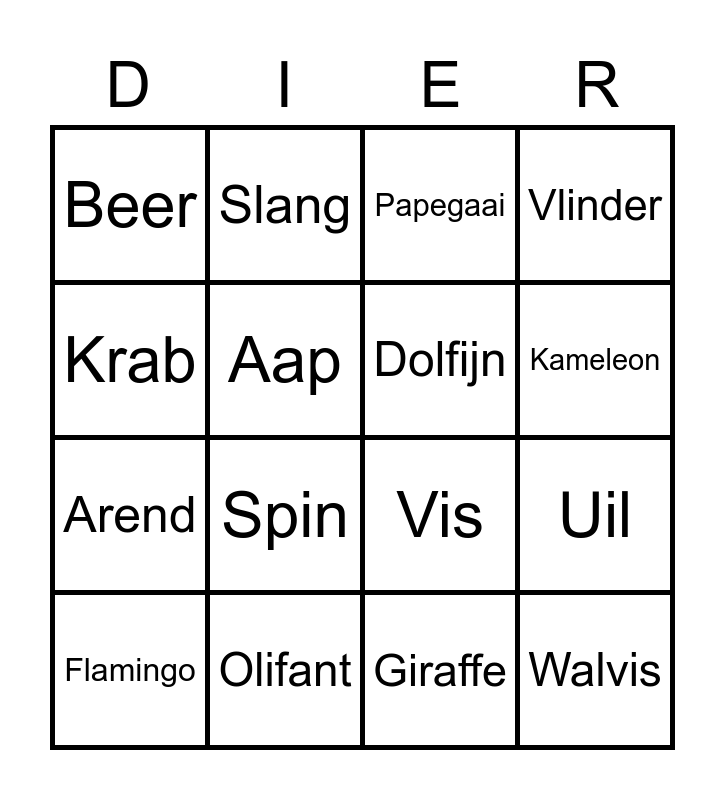This bingo card has 22 words: Olifant, Kikker, Slang, Leeuw, Aap, Dolfijn, Beer, Papegaai, Vis, Walvis, Arend, Vlinder, Luiaard, Paard, Giraffe, Nijlpaard, Uil, Flamingo, Spin, Krab, Kameleon and Rog.