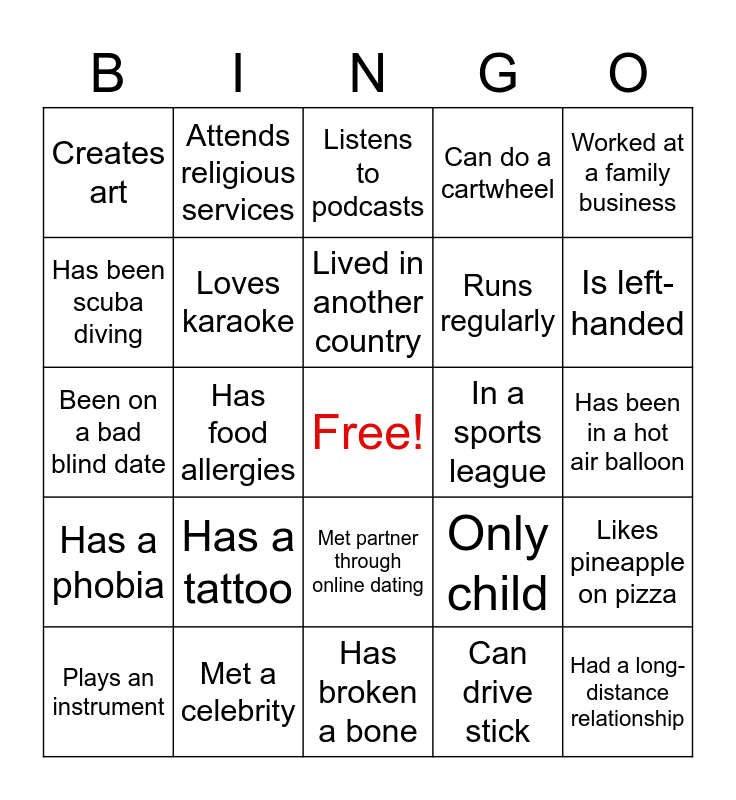 This bingo card has a free space and 24 words: Has a tattoo, Met a celebrity, Lived in another country, Plays an instrument, Worked at a family business, Creates art, Has been scuba diving, Attends religious services, In a sports league, Met partner through online dating, Runs regularly, Been on a bad blind date, Only child, Likes pineapple on pizza, Loves karaoke, Can drive stick, Has been in a hot air balloon, Listens to podcasts, Is left-handed, Has food allergies, Had a long-distance relationship, Has a phobia, Can do a cartwheel and Has broken a bone.