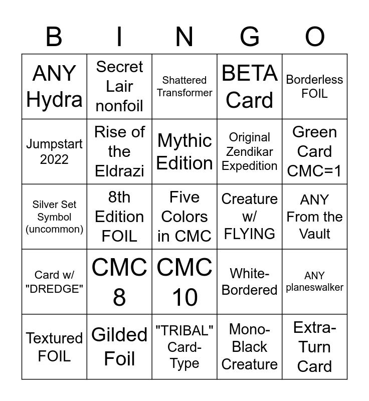 This bingo card has a free space and 24 words: CMC 8, Gilded Foil, Mythic Edition, Textured FOIL, Borderless FOIL, ANY Hydra, Jumpstart 2022, Secret Lair nonfoil, Creature w/ FLYING, CMC 10, Original Zendikar Expedition, Silver Set Symbol (uncommon), White-Bordered, ANY planeswalker, Rise of the Eldrazi, Mono-Black Creature, ANY From the Vault, Shattered Transformer, Green Card CMC=1, 8th Edition FOIL, Extra-Turn Card, Card w/ "DREDGE", BETA Card and "TRIBAL" Card-Type.