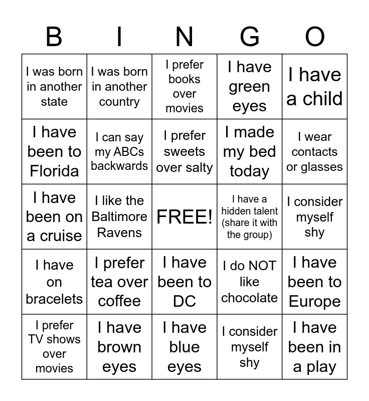 This bingo card has a free space and 24 words: I prefer TV shows over movies, I prefer tea over coffee, I prefer sweets over salty, I consider myself shy, I have a child, I was born in another state, I was born in another country, I prefer books over movies, I have a hidden talent (share it with the group), I consider myself shy, I have been on a cruise, I can say my ABCs backwards, I do NOT like chocolate, I have been to Europe, I have been to Florida, I have brown eyes, I have blue eyes, I have green eyes, I wear contacts or glasses, I have on bracelets, I like the Baltimore Ravens, I have been to DC, I made my bed today and I have been in a play.