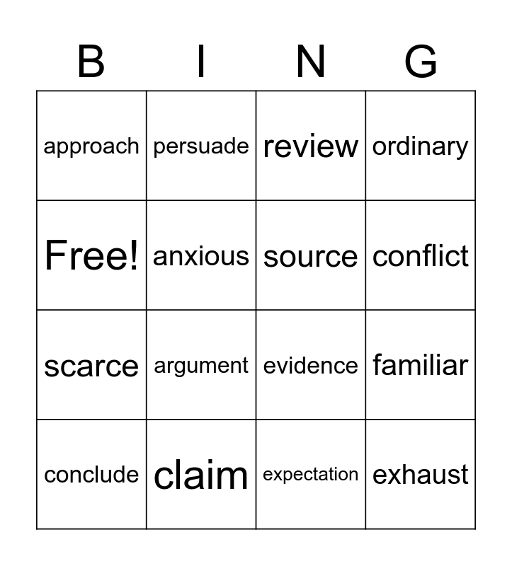 This bingo card has 16 words: claim, familiar, review, approach, scarce, persuade, evidence, expectation, Free!, anxious, conclude, ordinary, argument, conflict, source and exhaust.