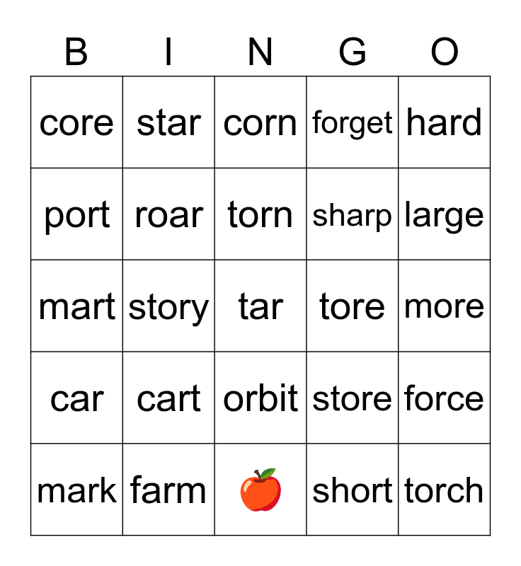 This bingo card has 25 words: car, farm, tar, short, hard, core, star, corn, tore, force, port, roar, 🍎, store, large, mark, story, torn, sharp, more, mart, cart, orbit, forget and torch.