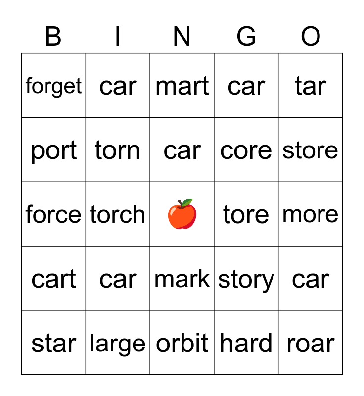 This bingo card has a free space and 29 words: star, farm, torch, cart, forget, mart, torn, car, tore, large, more, roar, orbit, hard, store, corn, mark, cart, tar, force, story, sharp, core, port, car, car, car, car and car.