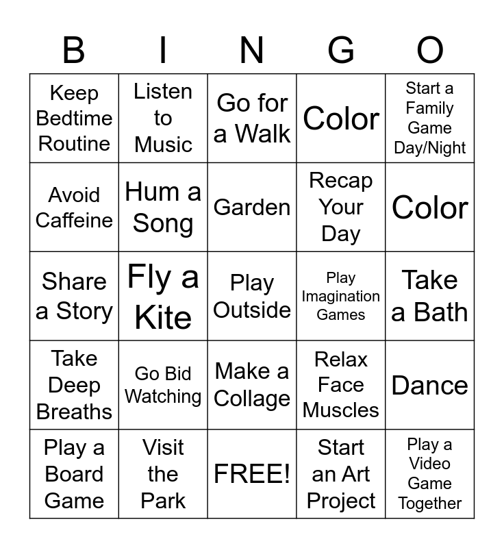 This bingo card has 25 words: Take Deep Breaths, Visit the Park, Play Outside, Start an Art Project, Start a Family Game Day/Night, Keep Bedtime Routine, Listen to Music, Go for a Walk, Play Imagination Games, Dance, Avoid Caffeine, Hum a Song, FREE!, Relax Face Muscles, Color, Play a Board Game, Fly a Kite, Garden, Recap Your Day, Take a Bath, Share a Story, Go Bid Watching, Make a Collage, Color and Play a Video Game Together.