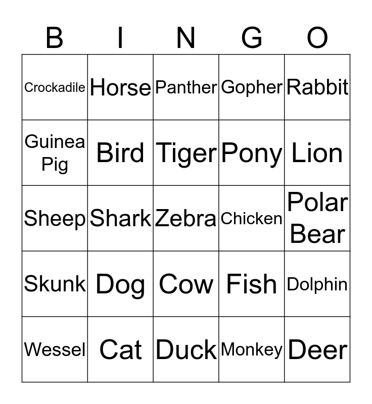 This bingo card has a free space and 24 words: Dog, Cat, Tiger, Wessel, Rabbit, Crockadile, Guinea Pig, Horse, Chicken, Cow, Pony, Sheep, Fish, Dolphin, Bird, Monkey, Polar Bear, Panther, Lion, Shark, Deer, Skunk, Gopher and Duck.