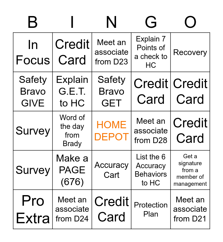 This bingo card has a free space and 24 words: Make a PAGE (676), Meet an associate from D24, Safety Bravo GET, Pro Extra, Recovery, In Focus, Safety Bravo GIVE, Credit Card, Meet an associate from D28, Accuracy Cart, Credit Card, Survey, List the 6 Accuracy Behaviors to HC, Get a signature from a member of management, Explain G.E.T. to HC, Protection Plan, Credit Card, Meet an associate from D23, Credit Card, Word of the day from Brady, Meet an associate from D21, Survey, Explain 7 Points of a check to HC and Credit Card.