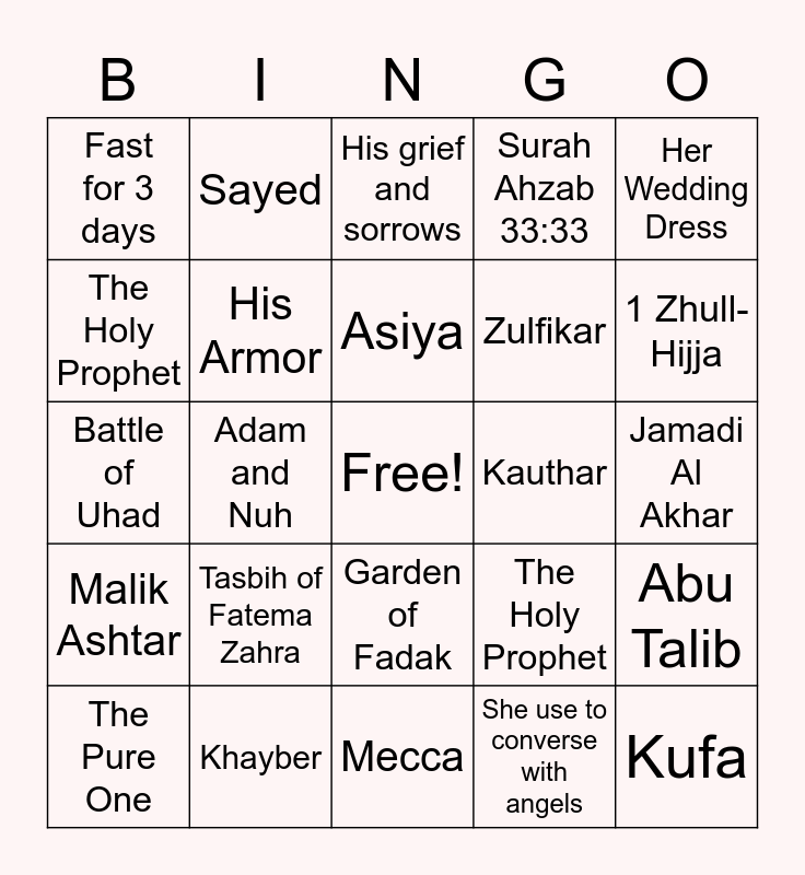 This bingo card has a free space and 25 words: Tasbih of Fatema Zahra, Mecca, Asiya, The Pure One, Her Wedding Dress, Fast for 3 days, The Holy Prophet, Sayed, Kauthar, Garden of Fadak, Zulfikar, Battle of Uhad, The Holy Prophet, Abu Talib, His Armor, 13th Rajab, Jamadi Al Akhar, His grief and sorrows, 1 Zhull-Hijja, Adam and Nuh, Kufa, Khayber, Malik Ashtar, Surah Ahzab 33:33 and She use to converse with angels.