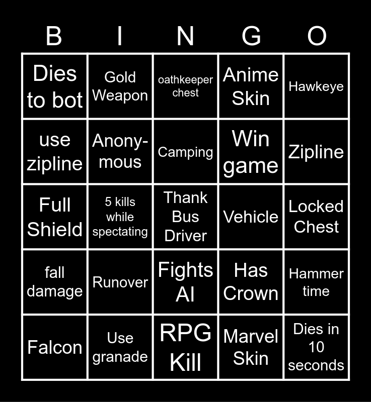 This bingo card has a free space and 24 words: Runover, Use granade, Camping, Falcon, Hawkeye, Dies to bot, use zipline, Gold Weapon, Vehicle, Fights AI, Win game, Full Shield, Has Crown, Hammer time, Anony-mous, Marvel Skin, Locked Chest, oathkeeper chest, Zipline, 5 kills while spectating, Dies in 10 seconds, fall damage, Anime Skin and RPG Kill.