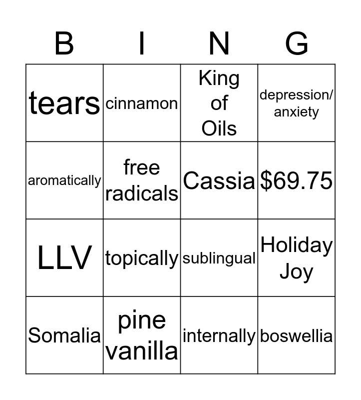 This bingo card has a free space and 15 words: Somalia, boswellia, King of Oils, tears, $69.75, aromatically, topically, internally, free radicals, LLV, Holiday Joy, depression/ anxiety, Cassia, cinnamon and pine vanilla.