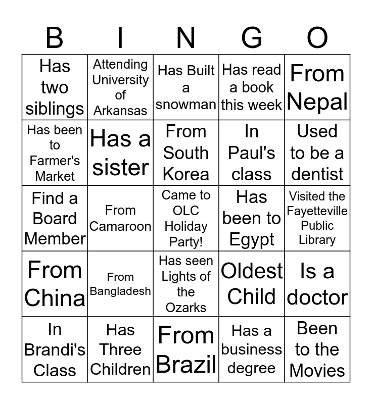 This bingo card has a free space and 24 words: From Bangladesh, Has Three Children, From South Korea, In Brandi's Class, From Nepal, Has two siblings, Has been to Farmer's Market, Attending University of Arkansas, Has been to Egypt, Has seen Lights of the Ozarks, In Paul's class, Find a Board Member, Oldest Child, Is a doctor, Has a sister, Has a business degree, Visited the Fayetteville Public Library, Has Built a snowman, Used to be a dentist, From Camaroon, Been to the Movies, From China, Has read a book this week and From Brazil.