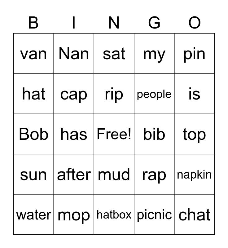 This bingo card has a free space and 24 words: after, mop, rip, water, pin, van, hat, Nan, bib, mud, people, Bob, rap, napkin, cap, picnic, top, sat, is, has, chat, sun, my and hatbox.