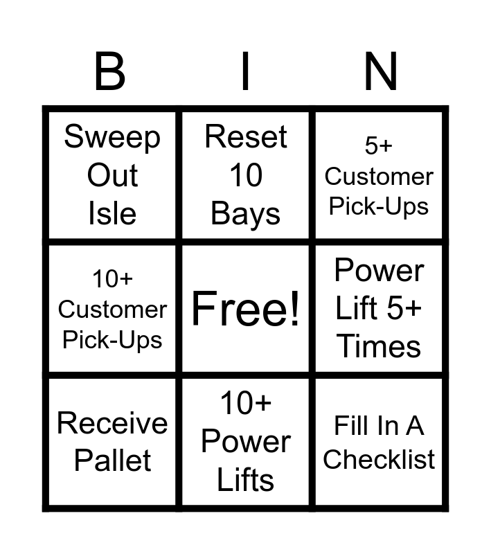 This bingo card has a free space and 9 words: Receive Pallet, 5+ Customer Pick-Ups, Reset 10 Bays, 10+ Customer Pick-Ups, Sweep Out Isle, Power Lift 5+ Times, Fill In A Checklist, 1+ TV Check and 10+ Power Lifts.