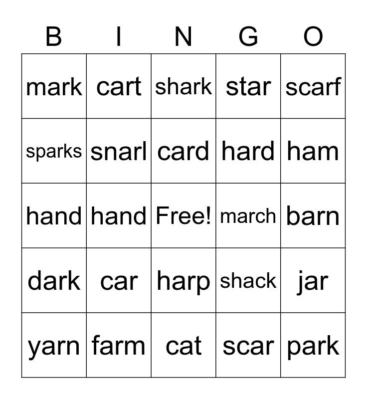 This bingo card has a free space and 24 words: car, farm, card, yarn, scarf, mark, sparks, cart, march, harp, hard, hand, shack, jar, snarl, scar, barn, shark, ham, hand, park, dark, star and cat.