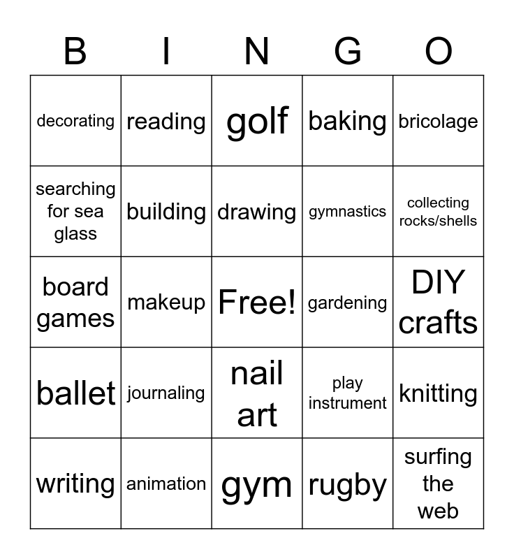 This bingo card has a free space and 24 words: writing, journaling, drawing, rugby, bricolage, decorating, reading, golf, gardening, DIY crafts, board games, building, play instrument, knitting, searching for sea glass, animation, gym, baking, collecting rocks/shells, ballet, makeup, nail art, gymnastics and surfing the web.