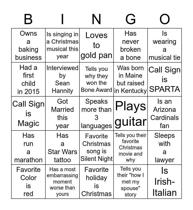 This bingo card has 25 words: Has a Star Wars tattoo, Favorite holiday is Christmas, Tells you why they won the Bone Award, Favorite Color is red, Is wearing a musical tie, Owns a baking business, Had a first child in 2015, Is singing in a Christmas musical this year, Plays guitar, Favorite Christmas song is Silent Night, Was born in Maine but raised in Kentucky, Call Sign is Magic, Tells you their favorite Christmas movie and why, Sleeps with a lawyer, Interviewed by Sean Hannity, Is Irish-Italian, Is an Arizona Cardinals fan, Loves to gold pan, Call Sign is SPARTA, Got Married this year, Speaks more than 3 languages, Has a most embarrassing moment worse than yours, Has run a marathon, Has never broken a bone and Tells you their "how I met my spouse" story.