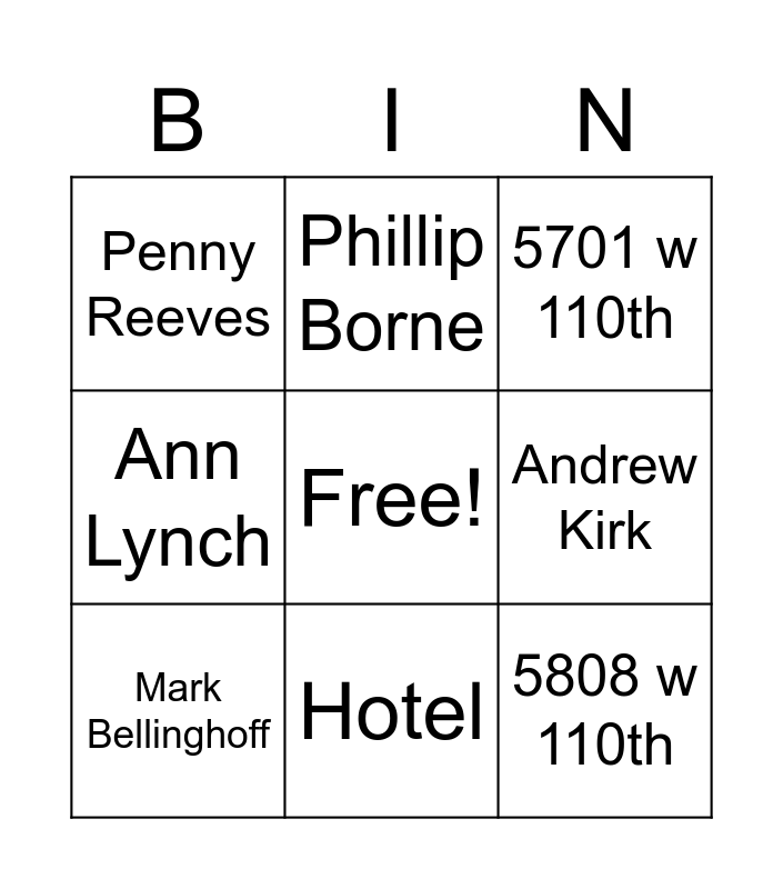 This bingo card has a free space and 8 words: Ann Lynch, Phillip Borne, Andrew Kirk, Mark Bellinghoff, 5701 w 110th, Penny Reeves, Hotel and 5808 w 110th.