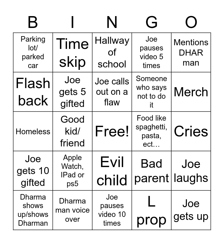 This bingo card has a free space and 24 words: Apple Watch, IPad or ps5, Dharma man voice over, Joe calls out on a flaw, Dharma shows up/shows Dharman, Mentions DHAR man, Parking lot/ parked car, Flash back, Time skip, Food like spaghetti, pasta, ect…, Evil child, Someone who says not to do it, Homeless, Bad parent, Joe laughs, Joe gets 5 gifted, L prop, Cries, Hallway of school, Merch, Good kid/ friend, Joe gets up, Joe gets 10 gifted, Joe pauses video 5 times and Joe pauses video 10 times.