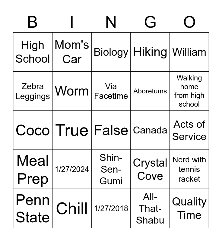 This bingo card has 25 words: 1/27/2024, 1/27/2018, Via Facetime, Penn State, William, High School, Zebra Leggings, Mom's Car, Canada, Shin-Sen-Gumi, Aboretums, Coco, Crystal Cove, Nerd with tennis racket, Worm, Quality Time, Acts of Service, Biology, Walking home from high school, True, False, Chill, Meal Prep, Hiking and All-That-Shabu.