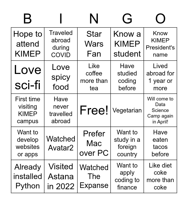 This bingo card has a free space and 24 words: Watched Avatar2, Visited Astana in 2022, Like coffee more than tea, Already installed Python, Know KIMEP President's name, Hope to attend KIMEP, Love sci-fi, Traveled abroad during COVID, Vegetarian, Prefer Mac over PC, Have studied coding before, First time visiting KIMEP campus, Want to study in a foreign country, Have eaten tacos before, Love spicy food, Want to apply coding to finance, Will come to Data Science Camp again in April!, Star Wars Fan, Lived abroad for 1 year or more, Have never travelled abroad, Like diet coke more than coke, Want to develop websites or apps, Know a KIMEP student and Watched The Expanse.
