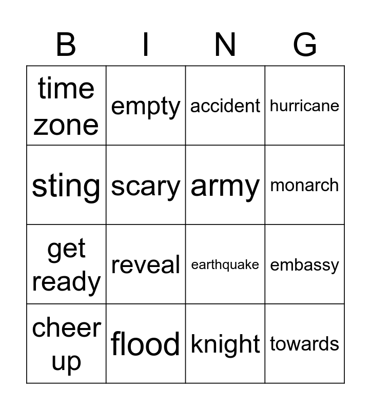 This bingo card has 28 words: crack, correct, get ready, damage, scary, accident, empty, towards, flood, avalanche, earthquake, hurricane, volcanic eruption, library, reveal, possible, stepdaughter, army, monarch, axis, time zone, heart attack, cheer up, embassy, knight, punctuation, sting and wipe out.