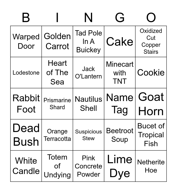 This bingo card has 25 words: Orange Terracotta, Pink Concrete Powder, Jack O'Lantern, White Candle, Oxidized Cut Copper Stairs, Warped Door, Lodestone, Golden Carrot, Name Tag, Suspicious Stew, Minecart with TNT, Rabbit Foot, Beetroot Soup, Bucet of Tropical Fish, Heart of The Sea, Netherite Hoe, Goat Horn, Tad Pole In A Buickey, Cookie, Prismarine Shard, Nautilus Shell, Totem of Undying, Dead Bush, Cake and Lime Dye.