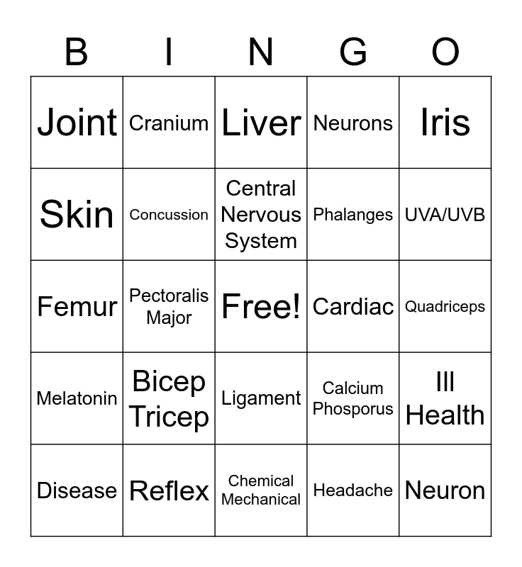 This bingo card has a free space and 24 words: Bicep Tricep, Reflex, Central Nervous System, Disease, Iris, Joint, Skin, Cranium, Cardiac, Ligament, Phalanges, Femur, Calcium Phosporus, Ill Health, Concussion, Headache, Quadriceps, Liver, UVA/UVB, Pectoralis Major, Neuron, Melatonin, Neurons and Chemical Mechanical.