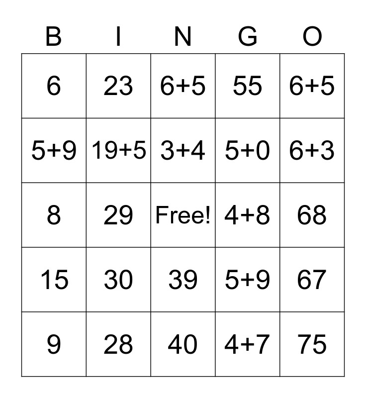 This bingo card has a free space and 75 words: 10+4, 8+8, 6+5, 4+6, 6+1, 2+0, 20+7, 9+2, 4+7, 6+12, 3+8, 9+8, 4+8, 6+3, 4+9, 19+5, 3+3, 5+9, 6+4, 5+9, 2+10, 3+4, 5+0, 6+5, 6, 21, 35, 51, 66, 7, 22, 36, 52, 67, 8, 23, 37, 53, 68, 9, 24, 38, 54, 69, 10, 25, 39, 55, 70, 11, 26, 40, 56, 71, 12, 27, 41, 57, 72, 13, 28, 42, 58, 73, 14, 29, 43, 59, 74, 15, 30, 44, 60, 75 and 45.