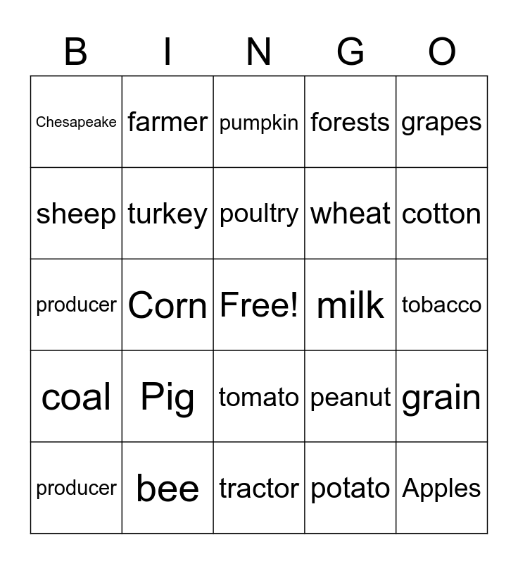 This bingo card has a free space and 24 words: Pig, bee, poultry, producer, grapes, Chesapeake, sheep, farmer, milk, tomato, wheat, producer, peanut, grain, turkey, potato, tobacco, pumpkin, cotton, Corn, Apples, coal, forests and tractor.