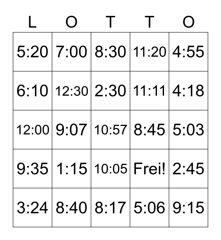 This bingo card has 25 words: 1:15, 8:17, 2:30, 3:24, 4:55, 5:20, 6:10, 7:00, 8:45, 10:05, 11:11, 12:00, Frei!, 2:45, 12:30, 9:15, 5:03, 8:30, 4:18, 9:07, 10:57, 8:40, 9:35, 11:20 and 5:06.