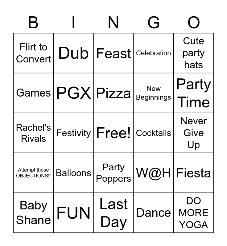 This bingo card has a free space and 24 words: Balloons, FUN, Pizza, Baby Shane, Cute party hats, Flirt to Convert, Games, Dub, Cocktails, Party Poppers, New Beginnings, Rachel's Rivals, W@H, Fiesta, PGX, Dance, Never Give Up, Feast, Party Time, Festivity, DO MORE YOGA, Attempt those OBJECTIONS!!, Celebration and Last Day.