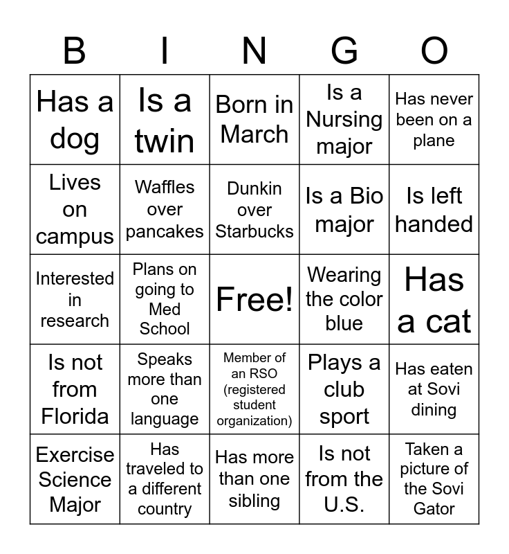 This bingo card has a free space and 24 words: Speaks more than one language, Has traveled to a different country, Dunkin over Starbucks, Exercise Science Major, Has never been on a plane, Has a dog, Lives on campus, Is a twin, Wearing the color blue, Member of an RSO (registered student organization), Is a Bio major, Interested in research, Plays a club sport, Has eaten at Sovi dining, Waffles over pancakes, Is not from the U.S., Has a cat, Born in March, Is left handed, Plans on going to Med School, Taken a picture of the Sovi Gator, Is not from Florida, Is a Nursing major and Has more than one sibling.