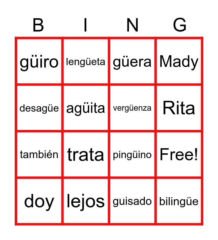 This bingo card has 20 words: Free!, antigüedad, güera, cigüeña, doy, desagüe, lejos, güiro, también, lengüeta, trata, pingüino, agüita, bilingüe, vergüenza, Federico, Rita, Mady, guisado and guepardo.