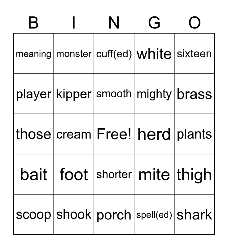 This bingo card has a free space and 24 words: foot, shook, smooth, scoop, sixteen, meaning, player, monster, herd, shorter, mighty, those, mite, thigh, kipper, spell(ed), plants, cuff(ed), brass, cream, shark, bait, white and porch.