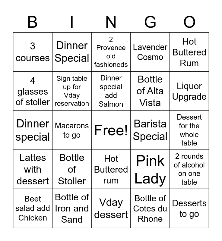This bingo card has a free space and 24 words: Bottle of Stoller, Bottle of Iron and Sand, Dinner special add Salmon, Beet salad add Chicken, Hot Buttered Rum, 3 courses, 4 glasses of stoller, Dinner Special, Barista Special, Hot Buttered rum, Bottle of Alta Vista, Dinner special, Pink Lady, 2 rounds of alcohol on one table, Sign table up for Vday reservation, Bottle of Cotes du Rhone, Dessert for the whole table, 2 Provence old fashioneds, Liquor Upgrade, Macarons to go, Desserts to go, Lattes with dessert, Lavender Cosmo and Vday dessert.