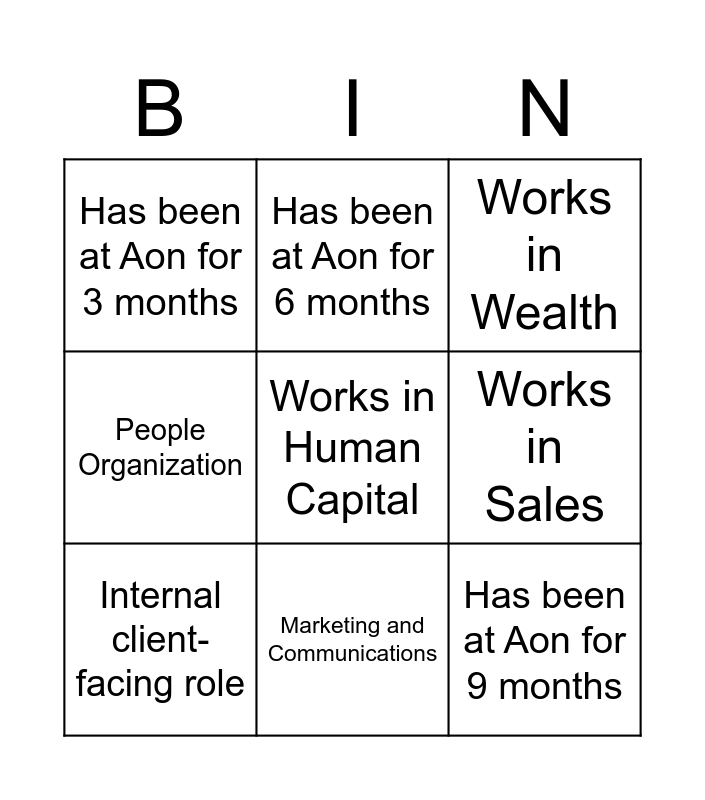 This bingo card has 19 words: Free!, Works in Commercial Risk, Works in Wealth, Works in Health, Works in Reinsurance, Works in Human Capital, Has been at Aon for <1 month, Has been at Aon for 3 months, Has been at Aon for 6 months, Has been at Aon for 9 months, Works in Operations, Works in Sales, Internal client-facing role, Broker, Account Executive, Finance, People Organization, Marketing and Communications and Law and Compliance.