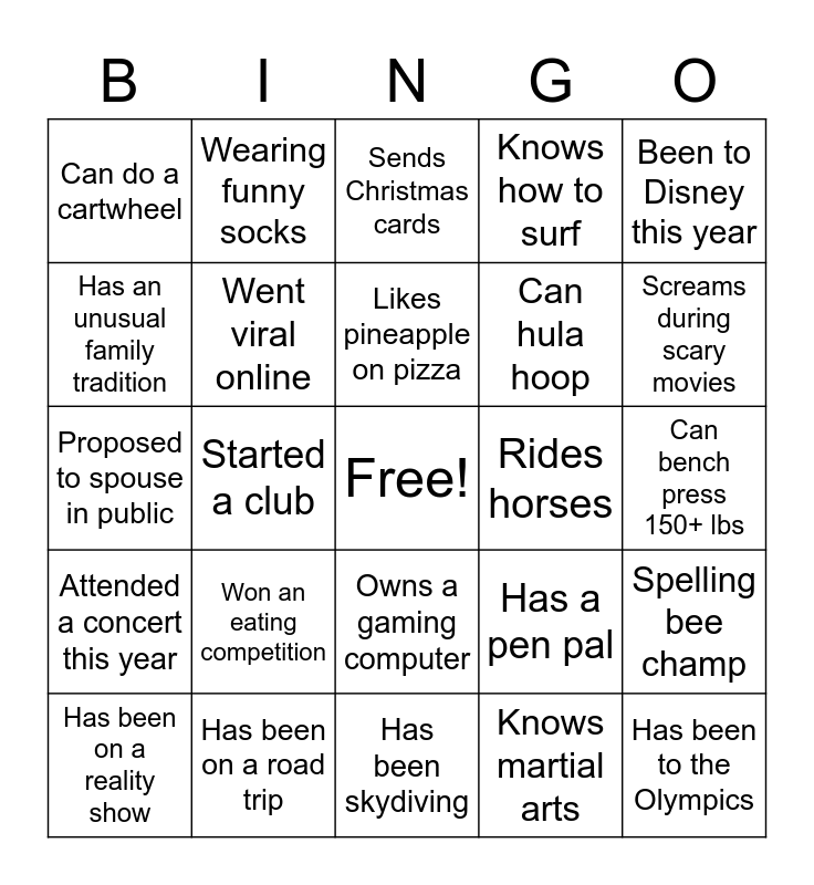 This bingo card has a free space and 35 words: Knows how to read tarot, Knows ASL, Met a celebrity, Went viral online, Owns a gaming computer, Knows how to surf, Has an unusual family tradition, Loves true crime podcasts, Likes pineapple on pizza, Been on a bad blind date, Proposed to spouse in public, Been to Disney this year, Loves roller coasters, Does Yoga, Can do a cartwheel, Rides horses, Knows martial arts, Started a club, Attended a concert this year, Has been to the Olympics, Has a pen pal, Has been on a reality show, Spelling bee champ, Has been on a road trip, Sends Christmas cards, Screams during scary movies, Loves karaoke, Was lead in a play, Can hula hoop, Can bench press 150+ lbs, Good at escape rooms, Has been skydiving, Won an eating competition, Wearing funny socks and Won at a casino.