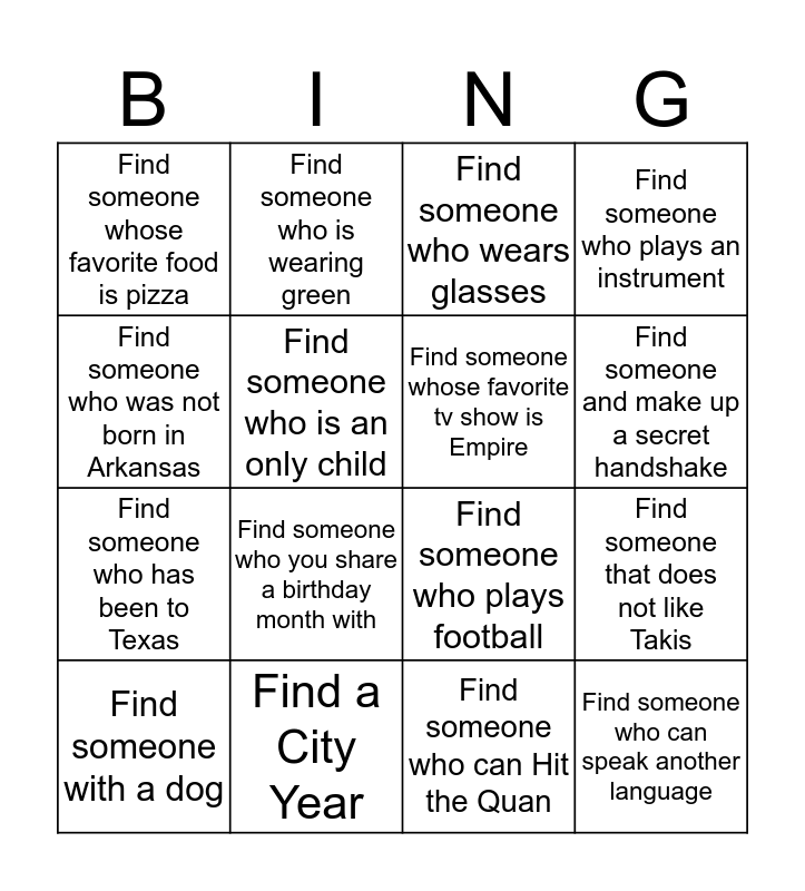 This bingo card has a free space and 15 words: Find someone with a dog, Find someone who can speak another language, Find someone who wears glasses, Find someone whose favorite food is pizza, Find someone and make up a secret handshake, Find someone who was not born in Arkansas, Find someone who you share a birthday month with, Find someone who can Hit the Quan, Find someone who is an only child, Find someone who has been to Texas, Find someone that does not like Takis, Find someone who plays an instrument, Find someone whose favorite tv show is Empire, Find someone who is wearing green and Find a City Year.