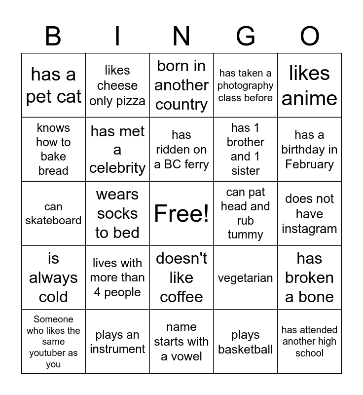 This bingo card has a free space and 29 words: Someone who likes the same youtuber as you, doesn't have an iphone, wears socks to bed, can speak 3+ languages, has a pet cat, born in another country, has met a celebrity, lives with more than 4 people, can pat head and rub tummy, plays an instrument, does not have instagram, has attended another high school, name starts with a vowel, plays basketball, has a birthday in February, has been to another province, doesn't like coffee, is always cold, likes anime, can skateboard, vegetarian, shops online, has 1 brother and 1 sister, knows how to bake bread, has taken a photography class before, likes cheese only pizza, has broken a bone, has ridden on a BC ferry and likes vegetables.