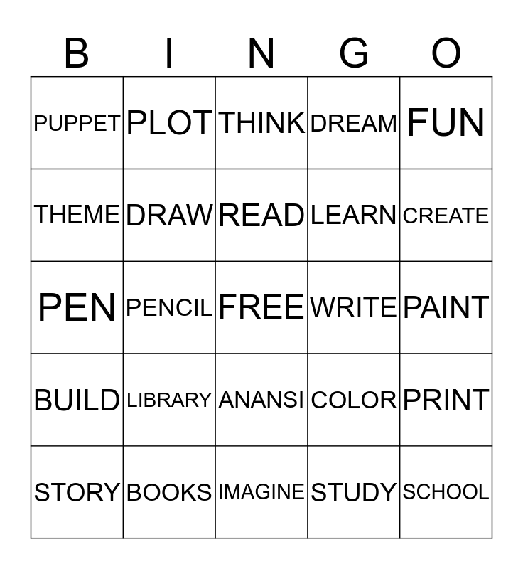 This bingo card has a free space and 24 words: LIBRARY, BOOKS, READ, STORY, FUN, PUPPET, THEME, PLOT, WRITE, ANANSI, LEARN, PEN, COLOR, PRINT, DRAW, STUDY, PAINT, THINK, CREATE, PENCIL, SCHOOL, BUILD, DREAM and IMAGINE.
