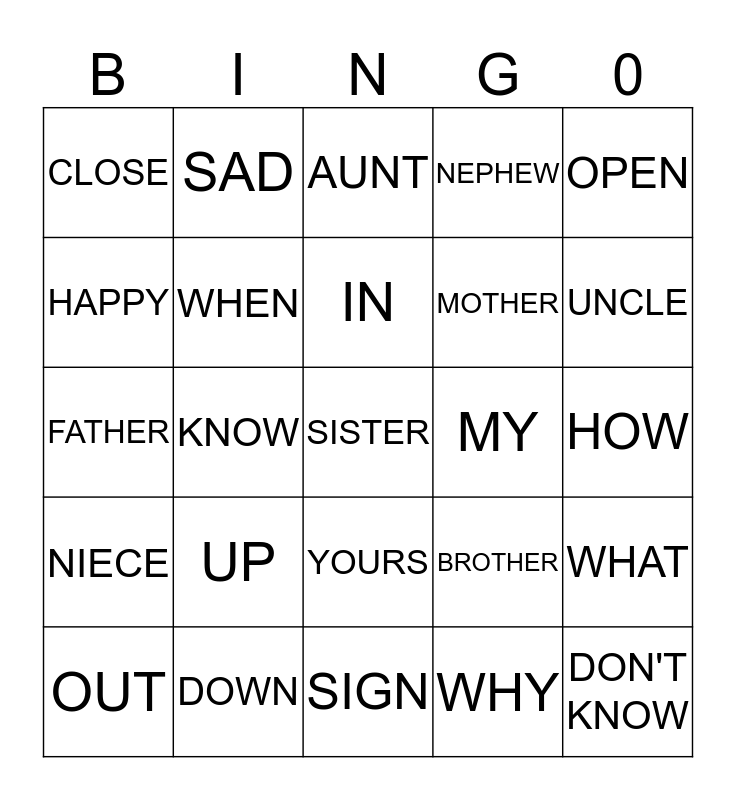 This bingo card has a free space and 24 words: UP, DOWN, IN, OUT, OPEN, CLOSE, HAPPY, SAD, MY, YOURS, MOTHER, FATHER, BROTHER, WHAT, WHEN, WHY, HOW, AUNT, UNCLE, KNOW, DON'T KNOW, NIECE, NEPHEW and SIGN.