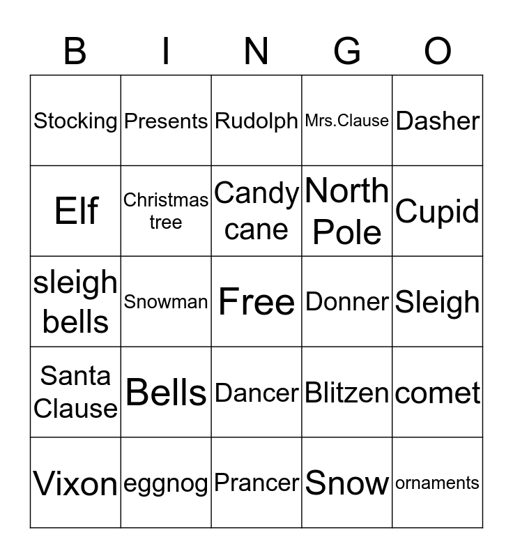 This bingo card has a free space and 24 words: Bells, eggnog, Candy cane, Vixon, Dasher, Stocking, Elf, Presents, Donner, Dancer, North Pole, sleigh bells, Blitzen, comet, Christmas tree, Snow, Sleigh, Rudolph, Cupid, Snowman, ornaments, Santa Clause, Mrs.Clause and Prancer.