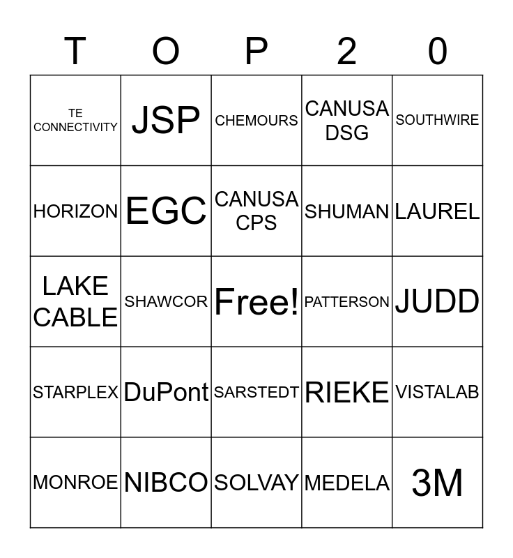 This bingo card has a free space and 24 words: DuPont, NIBCO, CANUSA CPS, MONROE, SOUTHWIRE, TE CONNECTIVITY, HORIZON, JSP, PATTERSON, SARSTEDT, SHUMAN, LAKE CABLE, RIEKE, VISTALAB, EGC, MEDELA, JUDD, CHEMOURS, LAUREL, SHAWCOR, 3M, STARPLEX, CANUSA DSG and SOLVAY.