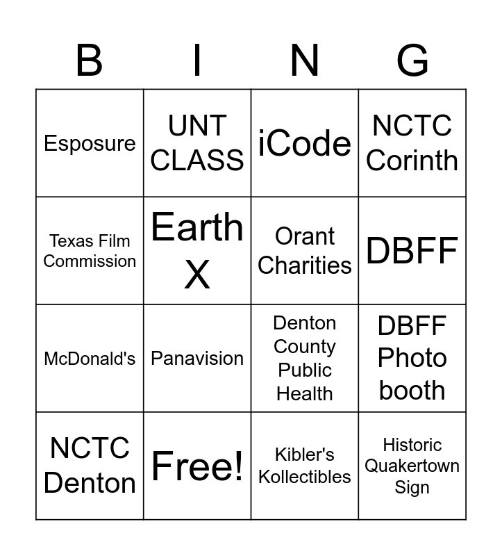 This bingo card has 16 words: Free!, DBFF Photo booth, iCode, Esposure, McDonald's, UNT CLASS, Denton County Public Health, Kibler's Kollectibles, Texas Film Commission, Earth X, NCTC Denton, NCTC Corinth, Panavision, DBFF, Orant Charities and Historic Quakertown Sign.