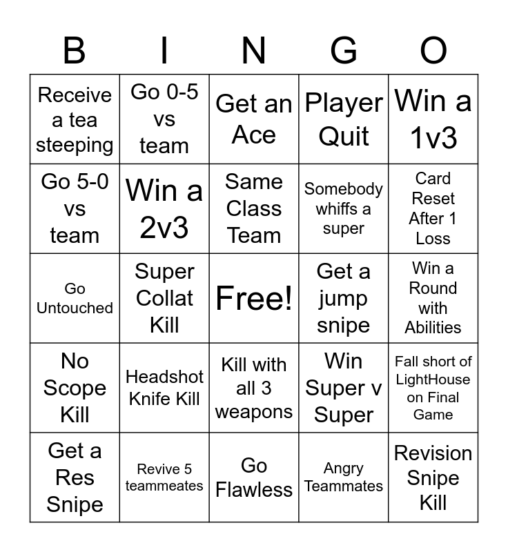 This bingo card has a free space and 24 words: Headshot Knife Kill, Revive 5 teammeates, Same Class Team, Get a Res Snipe, Win a 1v3, Receive a tea steeping, Go 5-0 vs team, Go 0-5 vs team, Get a jump snipe, Kill with all 3 weapons, Somebody whiffs a super, Go Untouched, Win Super v Super, Fall short of LightHouse on Final Game, Win a 2v3, Angry Teammates, Win a Round with Abilities, Get an Ace, Card Reset After 1 Loss, Super Collat Kill, Revision Snipe Kill, No Scope Kill, Player Quit and Go Flawless.