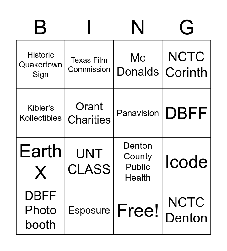 This bingo card has 17 words: Free!, DBFF Photo booth, Mc Donalds, Historic Quakertown Sign, UNT CLASS, NCTC Corinth, Icode, Panavision, DBFF, Orant Charities, Esposure, Denton County Public Health, Kibler's Kollectibles, Texas Film Commission, Earth X, Panavision and NCTC Denton.