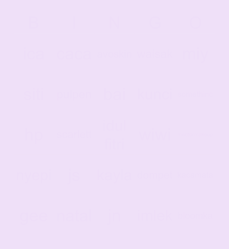This bingo card has 25 words: js, jn, bai, gee, miy, ica, siti, caca, wiwi, kayla, kunci, hp, dompet, kacamata, pulpen, bloomka, madformakeup, avoskin, somethinc, scarlett, idul fitri, natal, nyepi, waisak and imlek.